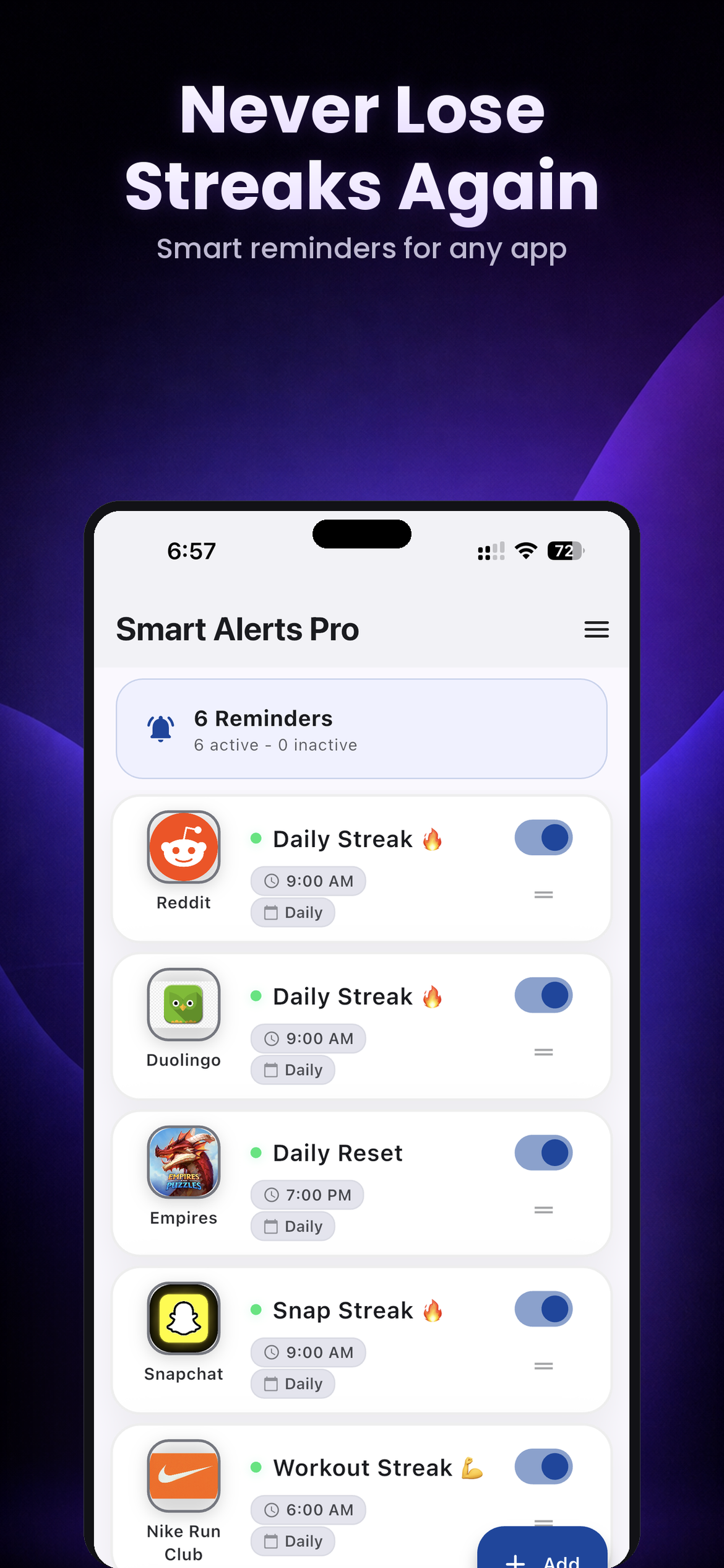 Smart reminders for any app. Reddit, Duolingo, Snapchat — keep every streak alive.